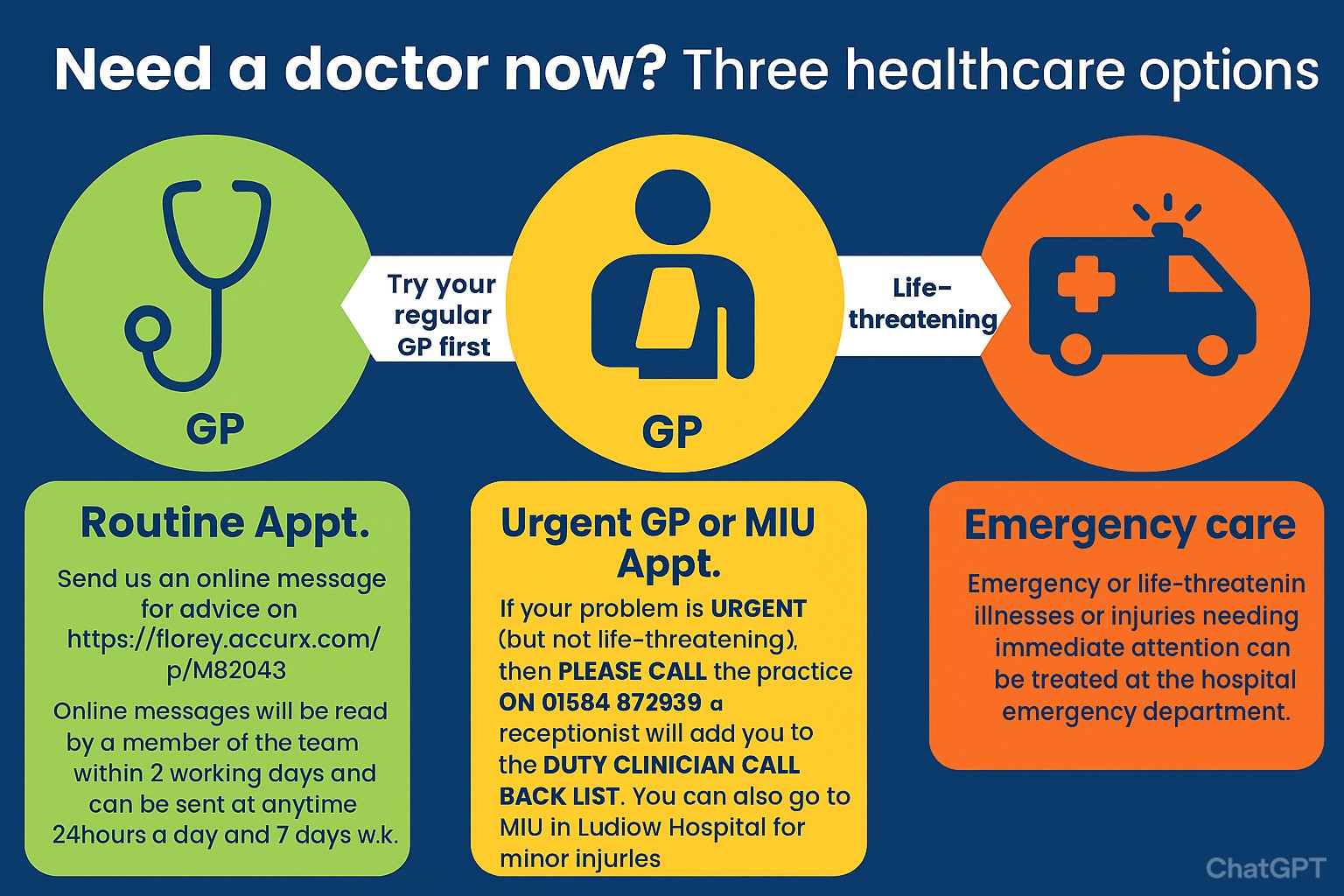 If your problem is URGENT (but not life-threatening ), then CALL the practice on 01584 872939 a receptionist will add you to the DUTY CLINICIAN CALL BACK LIST and the Duty Clinician will call you back usually within a few hours.